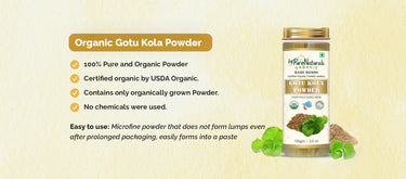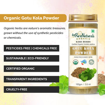 Experience the wellness benefits of byPureNaturals Organic Gotu Kola Powder. Certified 100% organic, it supports mental functions and promotes hair, skin, and connective tissue health. Revered in traditional medicine, Gotu Kola is hailed for its longevity benefits. Enhance brainpower, heal skin issues, and boost liver and kidney health naturally. With its convenient 100 gm packaging, incorporating this herbal supplement into your routine is effortless. Elevate your wellness journey with byPureNaturals Organic Gotu Kola Powder today.