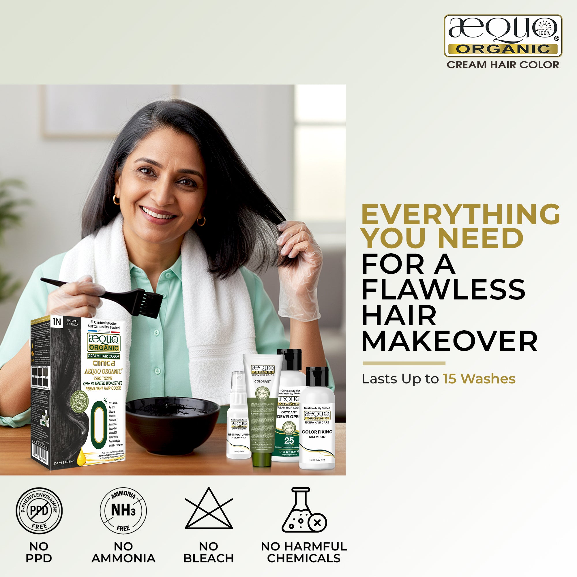 Unlike traditional chemical hair dyes, Aequo Organic offers a safe, clean, and effective solution for hair coloring. The patented molecule in our cream color not only imparts rich color but also treats and rejuvenates your hair from root to tip.