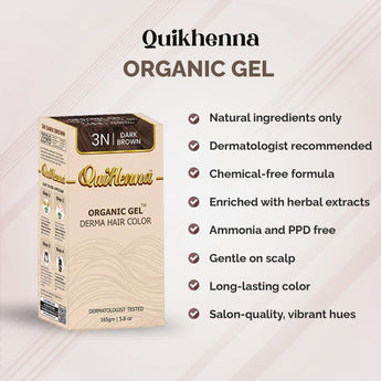 Experience the benefits of gentle, organic hair coloring with QuikHenna Organic Gel Derma Hair Color in 3N Dark Brown. Enjoy a naturally beautiful, healthy hair transformation!