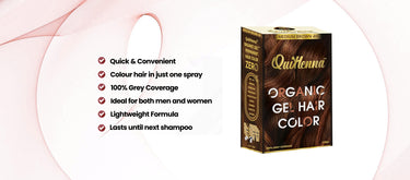 Experience vibrant, long-lasting color with the goodness of nature through QuikHenna Organic Gel Hair Color — a PPD-free, Ammonia-free, and gel-based hair color enriched with the Quick Henna Patented Hair Care Molecule. Specially formulated for safe and effective coloring, it delivers 100% grey coverage while strengthening and nourishing your hair from root to tip.