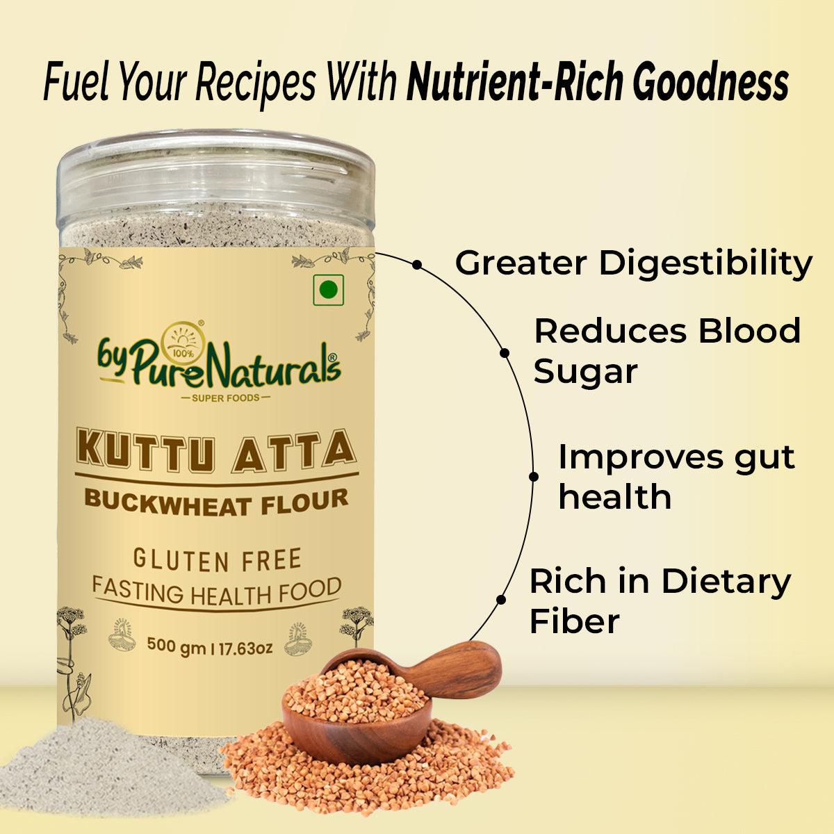 Power your fasting days with purity and nutrition through byPureNaturals Kuttu Atta, made from premium buckwheat grains finely ground into a soft, earthy flour. Traditionally consumed during vrat (fasting), Kuttu Atta is a naturally gluten-free source of protein, fiber, iron, and essential minerals, supporting digestion and sustained energy.