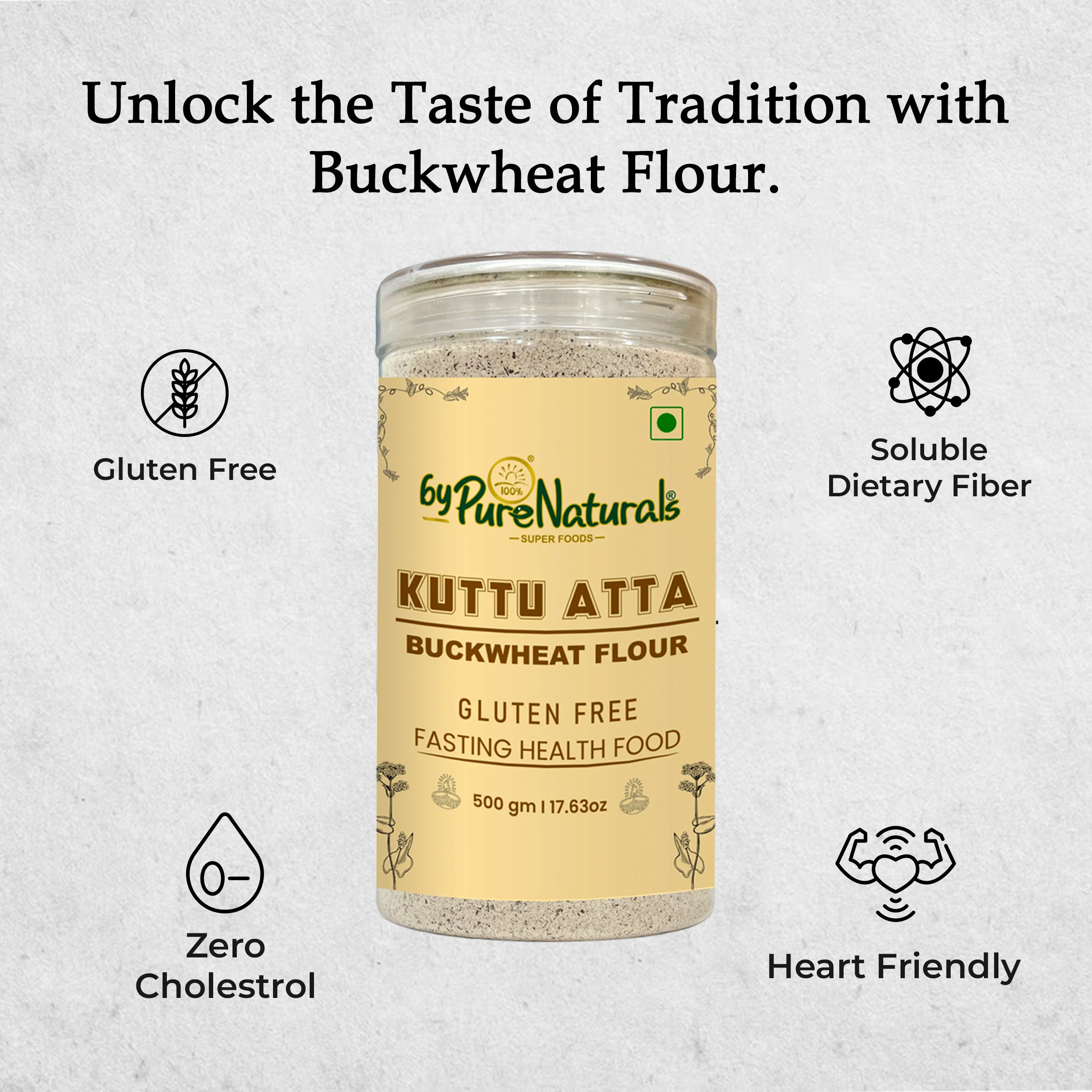 Power your fasting days with purity and nutrition through byPureNaturals Kuttu Atta, made from premium buckwheat grains finely ground into a soft, earthy flour. Traditionally consumed during vrat (fasting), Kuttu Atta is a naturally gluten-free source of protein, fiber, iron, and essential minerals, supporting digestion and sustained energy.