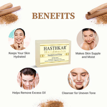 HYDRATED AND GLOWING SKIN: Hasthkar Handmades Sandalwood Soap keeps your skin hydrated and makes it supple and moist. Hasthkar Handmades Soap is your best choice for a relaxing bath experience. It provides a soothing sensation and keeps you feel comfortable and energetic throughout the day. It helps improving your skin tone and texture. It is a wonderful Glycerin moisturizing soap that works perfectly on both areas of your skin: dry and oily