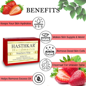 Dive into the refreshing indulgence of Hasthkar Handmades Glycerine Natural Strawberry Soap for soft, glowing skin. Infused with the essence of fresh strawberries, this soap gently cleanses while providing deep hydration and nourishment. Experience the delightful aroma and invigorating touch as it revitalizes your skin, leaving it smooth, radiant, and naturally refreshed. Perfect for all skin types, our glycerin-rich formula ensures a luxurious bathing experience, pampering your skin and awakening your senses with every use.
