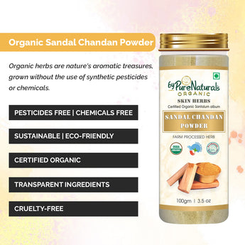 Elevate your skincare routine with PureNaturals' Organic Sandal Chandan Powder. Crafted from the finest organic sandalwood, this powder offers intensive skincare benefits, visibly enhancing brightness and smoothness. Gentle yet effective, it suits delicate skin, boasting natural and vegan credentials. Cruelty-Free and imbued with potent anti-inflammatory properties, it promotes healthy skin growth, unveiling a radiant complexion. Trust in PureNaturals for pure, natural ingredients, meticulously tested to ensure excellence. Experience the transformative power of sandalwood powder today.